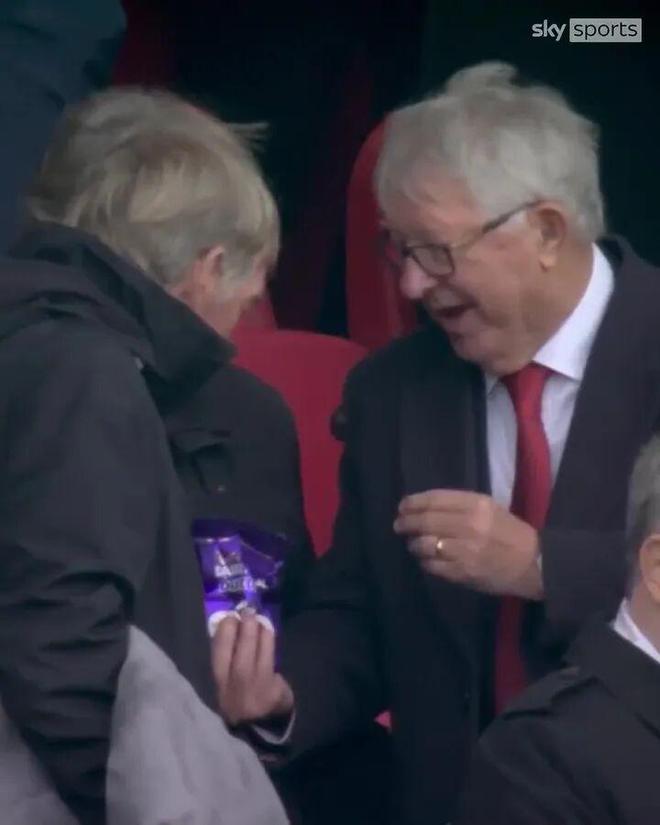 曼聯(lián)一球領(lǐng)先結(jié)束上半場,弗爵在看臺上也頗為輕松,與利物浦名宿達格利什分享了自己的巧克力。
