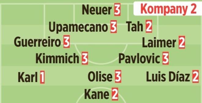 諾伊爾(3分);萊默爾(2分)、約納坦-塔(2分)、于帕梅卡諾(3分)、格雷羅(3分);亞歷山大-帕夫洛維奇(3分)、基米希(3分);路易斯-迪亞斯(2分)、奧利塞(3分)、倫納特-卡爾(1分);哈里-凱恩(2分)