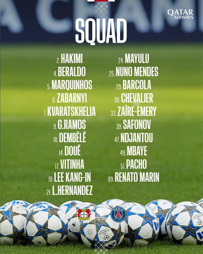 巴黎客戰(zhàn)勒沃庫(kù)森大名單: