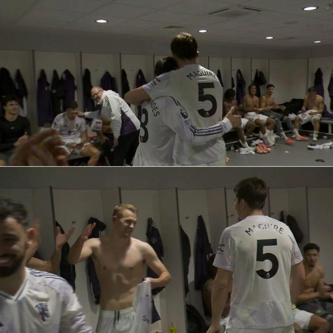 在打進制勝進球后,馬奎爾賽后回到更衣室并沒有進行太多的浮夸慶祝。他只是面帶微笑,與B費擁抱,與德里赫特擊掌,然后坐在自己的衣柜前休息。
