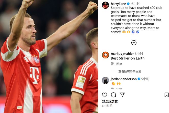 雷速體育10月19日訊 德甲第7輪比賽,拜仁2-1擊敗多特蒙德,凱恩打入了個人俱樂部生涯的第400球。賽后,凱恩更新個人社媒,談到了400球的感受。